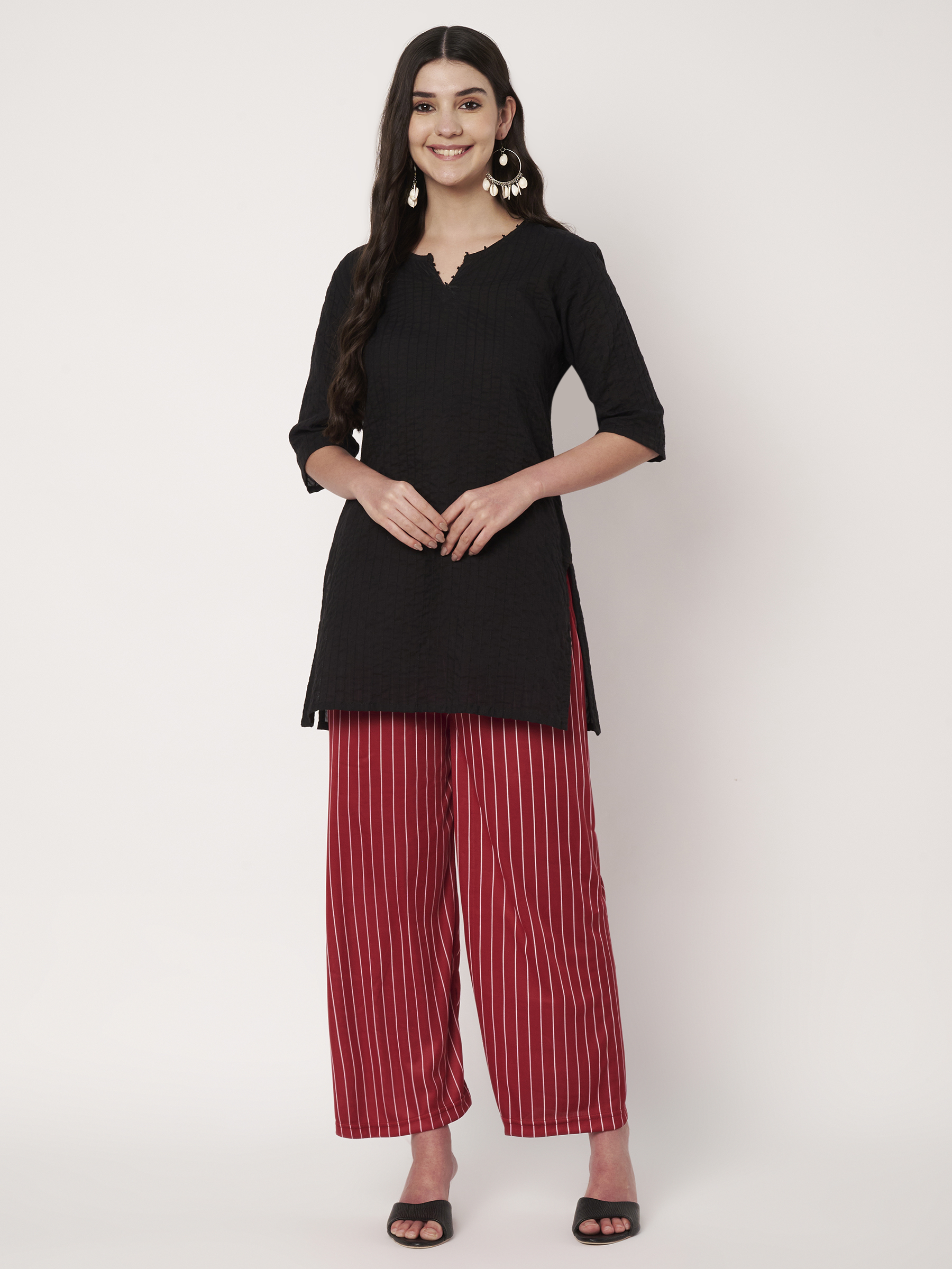 Striped, Red with White Vertical Stripes, Palazzo Pants, Relaxed Fit, Elasticated, Casual, Office, Daily Wear, Brunch, Travel