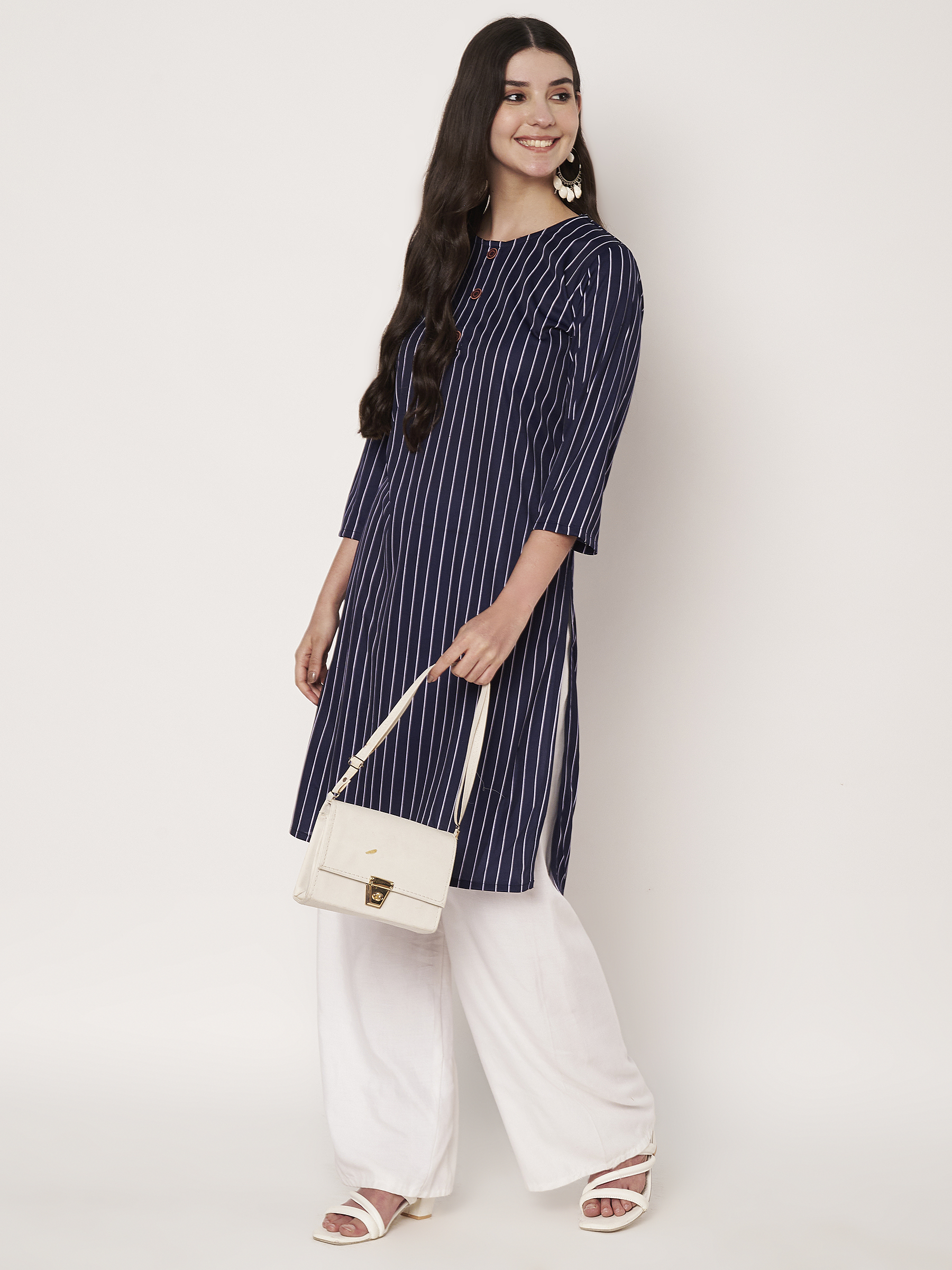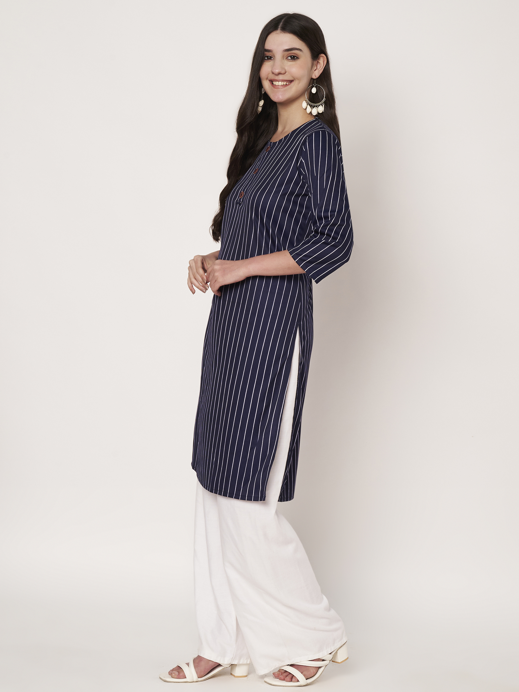 Model Name – Fashoraa-Blue & White Striped Cotton Straight Kurti for Women